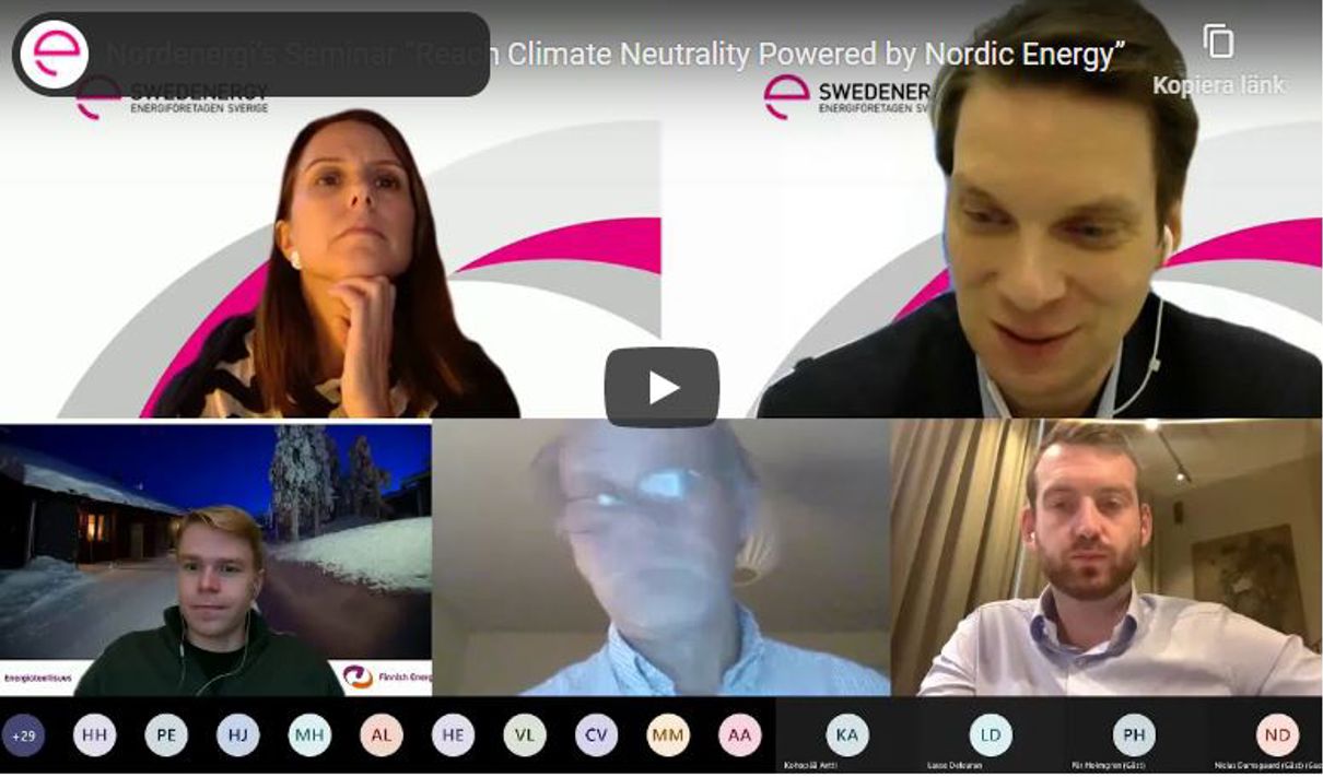 Nordenergi höll den 3 december ett seminarium om den nordiska energisektorns roll för att EU ska kunna uppnå klimatneutralitet 2050. Som medlem kan du se webbinariet i efterhand via energiforetagen.se/playmedlem.
