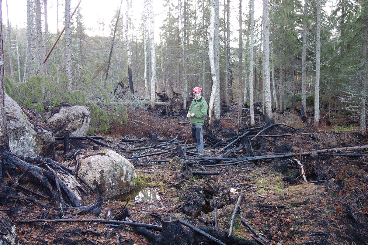 Christer Gruber, sakkunnig EBR på Energiföretagen Sverige, besöker skogen som härjades av skogsbrand i Västmanland 2018. Foto: Peter Silverhjärta, sakkunnig EBR.