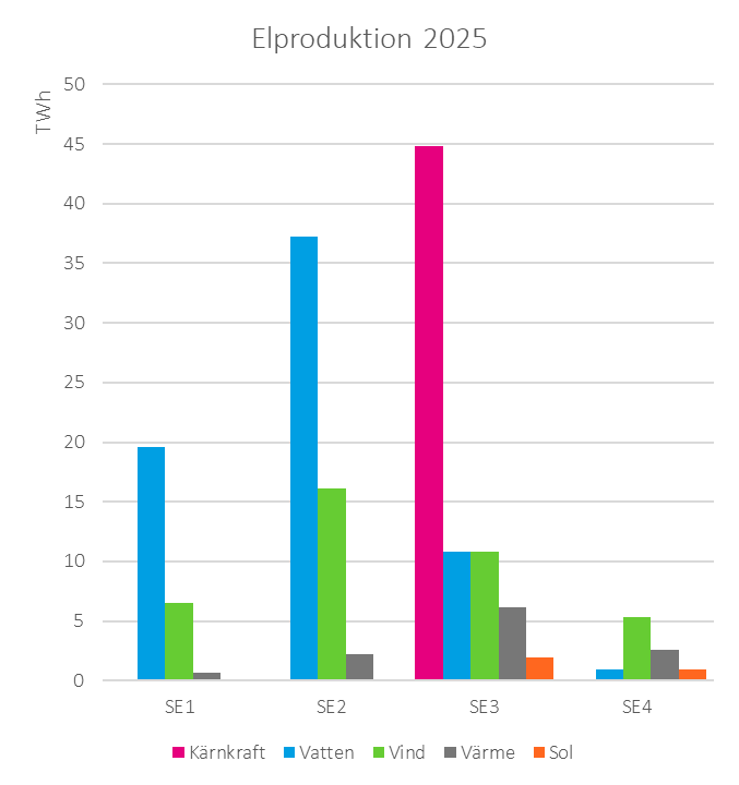 Så såg Sveriges elproduktion ut per elområde under 2025