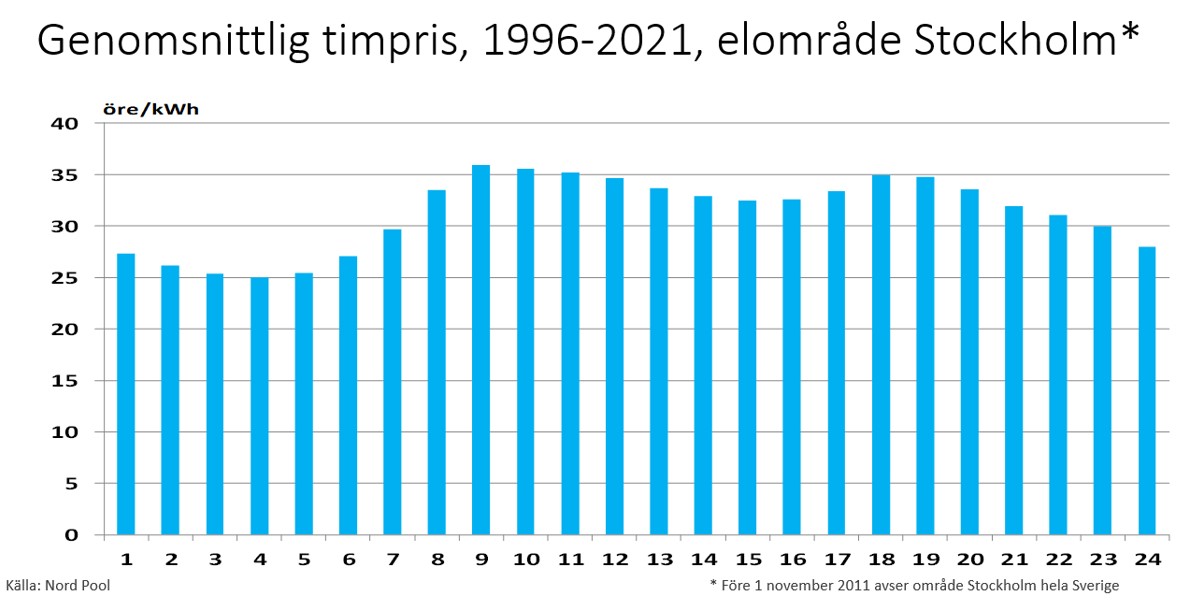 I nedanstående diagram illustreras hur det genomsnittliga timpriset på spotmarknaden varierat mellan åren 1996–2021.