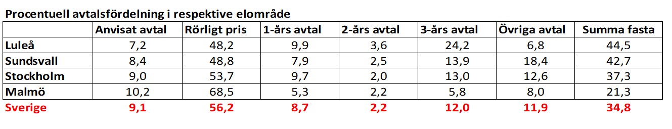 Kunder med avtal om rörligt pris har störst incitament att förändra sin elanvändning. I tabellen nedan redovisas hur fördelningen mellan olika avtalsformer såg ut enligt SCB:s statistik för oktober 2022. Andelen avtal om fast pris är störst i SE1 och andelen avtal om rörligt pris är störst i SE4, vilket är en bidragande förklaring till hur elanvändningen förändrats i de olika elområdena enligt ovan.